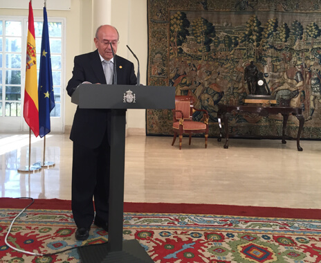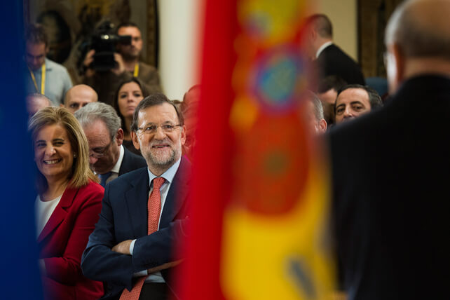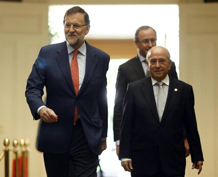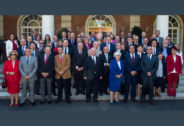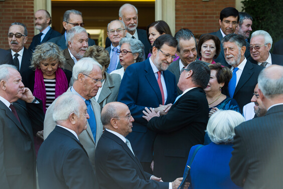 El presidente del Gobierno, Mariano Rajoy, ha presentado en el Palacio de La Moncloa, el Marco de Actuación de las Personas Mayores, acompañado por el presidente de UDP y vicepresidente del Consejo Estatal de Personas Mayores, Luis Martín Pindado y el ministro de Sanidad, Servicios Sociales e Igualdad, Alfonso Alonso y la ministra de Empleo y Seguridad Social, Fátima Báñez, entre otras autoridades.